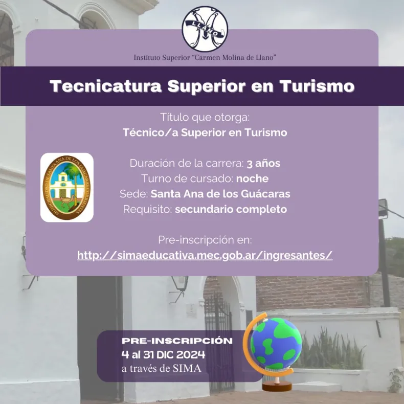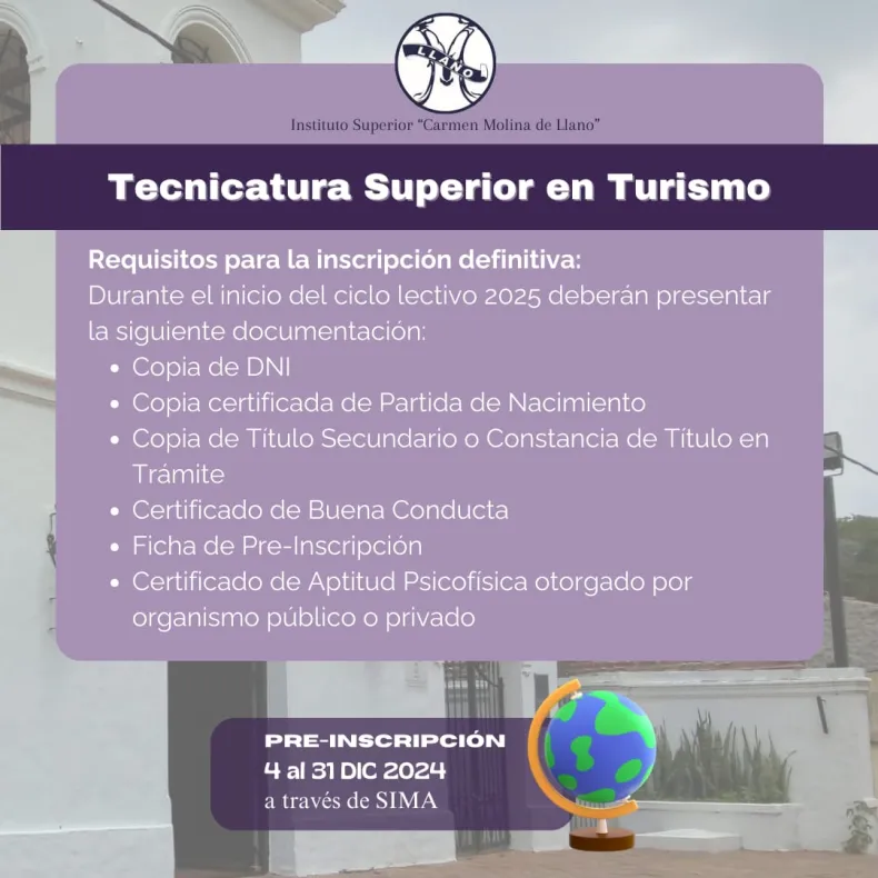 la Pre Inscripción a la Tecnicatura en Turismo está abierta!! 12/11/202412/11/2024 walter Rodriguez La pre inscripción estará habilitada hasta que se completar el cupo y se realiza por internet a través del portal SIMA.